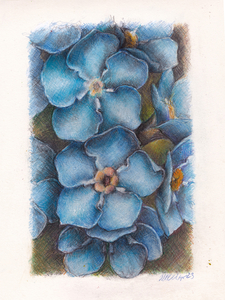 The Forget me Not is the State Flower of Alaska. It is said to symbolize true love and respect. This drawing is a rendered in Colored Pencil- enabling the achievement of detail, brightly saturated color and texture,