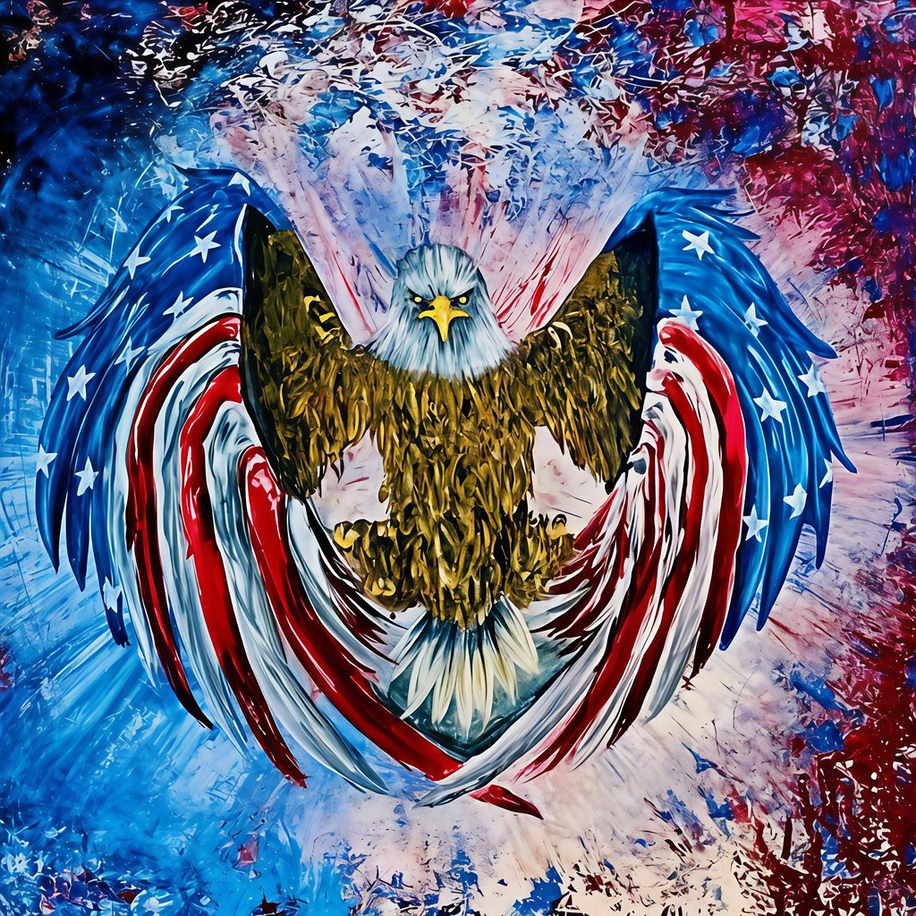 A bold patriotic eagle rises with wings shaped in the colors of the American flag, symbolizing strength, freedom, and unity. Vibrant strokes of red, white, and blue create an energetic backdrop that amplifies its powerful presence.