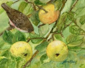 A bird checks out the golden apples trying to decide which one to nibble on in this watercolor on canvas original painting by Laurie Rohner.