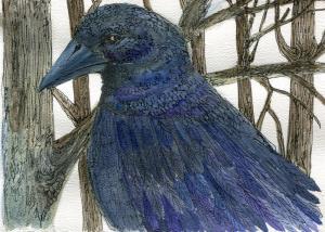 A whimsical old crow is painted in watercolor and ink in shades of purple and navy blue. The bare tree limbs surround him in the background of my illustration.