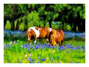 Miniature Horse's grazing in a field of Bluebonnets