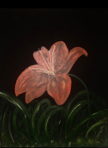 A beautiful peach Lily with a black background.