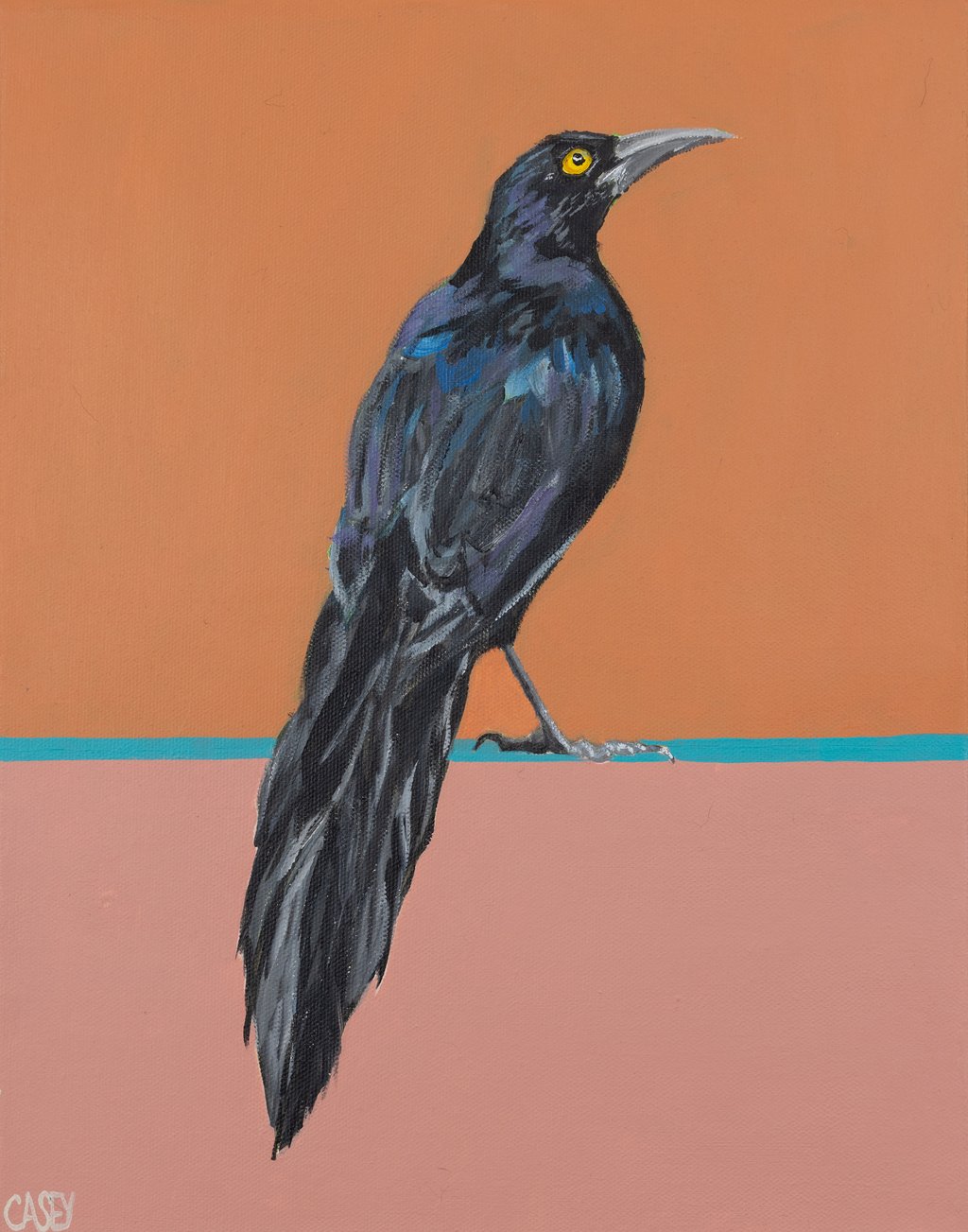 Augustus the Grackle. A songbird of the American blackbird family, the male of which has shiny black plumage with a blue-green sheen.