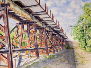 In this watercolor landscape of a rusty bridge, I was trying to capture the feel of the mid day heat, the way the daylight plays with the shadows cast by the bridge and how time has weathered the steel structure to rusty beams still standing proud and ready to be traveled on by the next train. I painted this watercolor on cold press paper using masking technique along with both wet on wet and wet on dry methods. Completed on 9-15-21