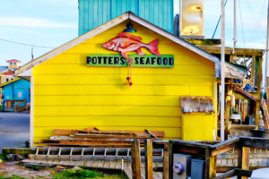 Side view of Potter's Seafood a long time part of Southport, North Carolina's Yacht Basin waterfront.
