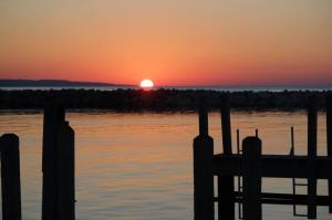 Sunset over Lake Michigan with fisherman's warfares and rocks in background.