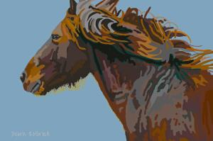 April, 2016 was the "birth of this painting"...a composition was formed. This Spanish Mustang enjoying the wind in his mane as he traverses the sandy shores of the Corolla 4x4 in the Outer Banks, NC. This is the second version named "Trotting in the Wind II" ....to try another color way.