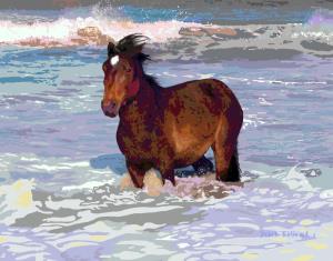 This photo of "Star" was taken March, 2008. Star was a horse that liked going into the waves of the Atlantic Ocean. I have known other horses that have done the same...it always amazes me. On days when there is a west wind that brings the flies, the horses flock to the shoreline to get some relief from the southern heat and horse flies. Great days to head out with my camera and zoom lens.