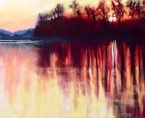 Capturing the setting sun over a still lake in late fall From original pastel painting