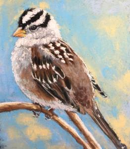 White crowned sparrows visit every fall here on the Central Coast of California. Original pastel painting by Donna Theresa Fine Art.