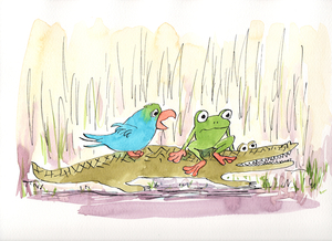 Watercolor and ink illustration of Caruso and Leo getting a ride from the Gator, from my children's book.