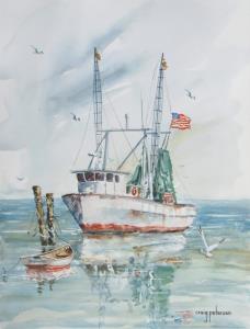 Shrimp boats are a familiar sight in the Gulf of Mexico. Watercolor painting