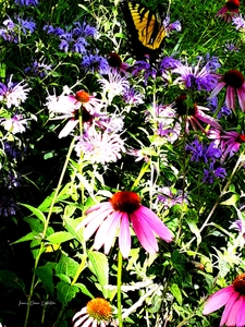 Wildflowers at the lake blooming with vibrant colors, reflecting the sun and a swallowtail butterfly. This piece is available in HD metal prints and framed art print on high quality velvet paper. Enhance your space with a colorful nature print with lovely contrasting colors.