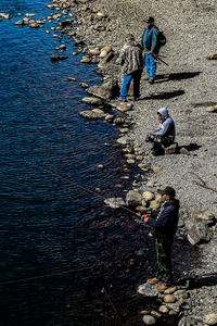 A group of people maintain safe social distancing while taking in a relaxing day of fishing at the base of California's Pine Flat Dam.