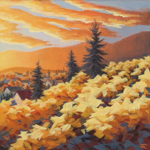 First sunrise golden light on the foothills of the Olympic Mountains, Port Angeles, WA