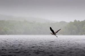 I caught this Great Blue Heron early on spring morning from my kayak heading across Lake Kinnelon tentatively. When they are truly "leaving town" the legs go fully parallel to the ground, so this was not a direct flight.