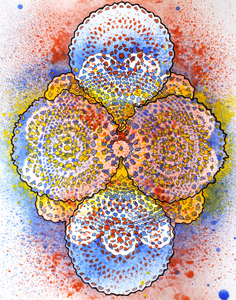 Works from the Stains series are created by spraying paint through found doilies to build up layers that are then manipulated by outlining portions of each layer with ink. Doilies, which are common products of traditional crochet, become substitutes for cells and are 'stained' with acrylic so that their nature might be further scrutinized, similar to how specimens are viewed under a microscope after being prepared on a slide. Crochet has become a useful tool in mathematics and science, so my work often contains organically inspired forms because crochet objects can be closely governed by the same mathematical principles and systems commonly found in nature. As a prolific crocheter, I have often noticed how the technique seems to mimic various biological processes such as cell growth and reproduction.