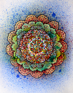 Works from the Stains series are created by spraying paint through found doilies to build up layers that are then manipulated by outlining portions of each layer with ink. Doilies, which are common products of traditional crochet, become substitutes for cells and are 'stained' with acrylic so that their nature might be further scrutinized, similar to how specimens are viewed under a microscope after being prepared on a slide. Crochet has become a useful tool in mathematics and science, so my work often contains organically inspired forms because crochet objects can be closely governed by the same mathematical principles and systems commonly found in nature. As a prolific crocheter, I have often noticed how the technique seems to mimic various biological processes such as cell growth and reproduction.