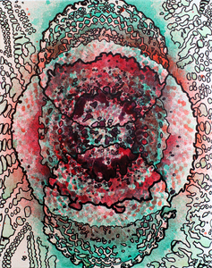 Works from the Stains series are created by spraying paint through found doilies to build up layers that are then manipulated by outlining portions of each layer with ink. Doilies, which are common products of traditional crochet, become substitutes for cells and are 'stained' with acrylic so that their nature might be further scrutinized, similar to how specimens are viewed under a microscope after being prepared on a slide. Crochet has become a useful tool in mathematics and science, so my work often contains organically inspired forms because crochet objects can be closely governed by the same mathematical principles and systems commonly found in nature. As a prolific crocheter, I have often noticed how the technique seems to mimic various biological processes such as cell growth and reproduction.