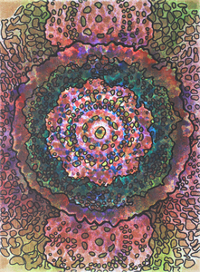 Works from the Stains series are created by spraying paint through found doilies to build up layers that are then manipulated by outlining portions of each layer with ink. Doilies, which are common products of traditional crochet, become substitutes for cells and are 'stained' with acrylic so that their nature might be further scrutinized, similar to how specimens are viewed under a microscope after being prepared on a slide. Crochet has become a useful tool in mathematics and science, so my work often contains organically inspired forms because crochet objects can be closely governed by the same mathematical principles and systems commonly found in nature. As a prolific crocheter, I have often noticed how the technique seems to mimic various biological processes such as cell growth and reproduction.