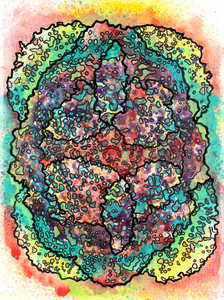 Works from the Stains series are created by spraying paint through found doilies to build up layers that are then manipulated by outlining portions of each layer with ink. Doilies, which are common products of traditional crochet, become substitutes for cells and are 'stained' with acrylic so that their nature might be further scrutinized, similar to how specimens are viewed under a microscope after being prepared on a slide. Crochet has become a useful tool in mathematics and science, so my work often contains organically inspired forms because crochet objects can be closely governed by the same mathematical principles and systems commonly found in nature. As a prolific crocheter, I have often noticed how the technique seems to mimic various biological processes such as cell growth and reproduction.