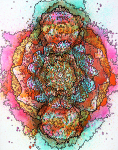 Works from the Stains series are created by spraying paint through found doilies to build up layers that are then manipulated by outlining portions of each layer with ink. Doilies, which are common products of traditional crochet, become substitutes for cells and are 'stained' with acrylic so that their nature might be further scrutinized, similar to how specimens are viewed under a microscope after being prepared on a slide. Crochet has become a useful tool in mathematics and science, so my work often contains organically inspired forms because crochet objects can be closely governed by the same mathematical principles and systems commonly found in nature. As a prolific crocheter, I have often noticed how the technique seems to mimic various biological processes such as cell growth and reproduction.