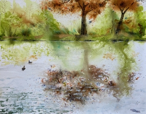 Light playing on the water was the emphasis of this autumn watercolor painting.