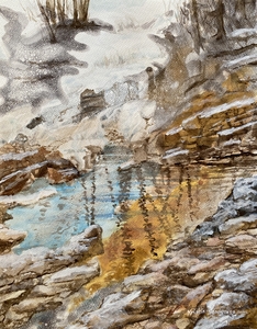 This abstract painting was inspired by a walk in the woods during the spring thaw. Watercolor & ink.