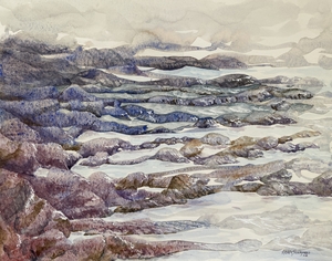Abstract watercolor of a misty, rocky shoreline.