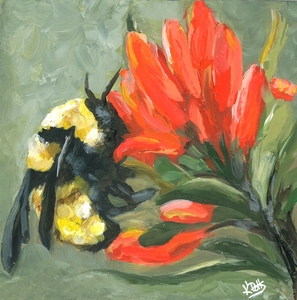 This busy bumblebee is pollinating a vibrant red-orange flower.