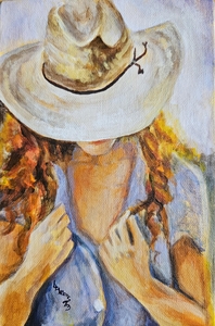 Cowgirl, cowboy hat, cowgirl looking down, nodding cowgirl, sexy cowgirl, redhead cowgirl, flirty cowgirl