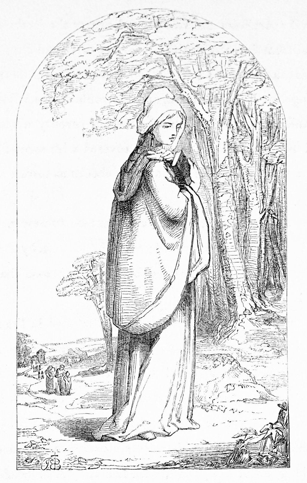 This illustration is from Page 6 of the book of Henry Longfellow’s epic poem "Evangeline A Tale of Acadie" (London, Bogue, 1850), the first known illustrated version. Jane Eleanor Benham Hay (1829 –1904) was a British painter and illustrator, a virtual pioneer of Victorian female artists. British publisher Henry Richard Vizetelly(1820 – 1894) was the book’s engraver. The image was scanned from an original first edition copy of the book. Part the First, Canto I. “Down the long street she passed, with her chaplet of beads and her missal, Wearing her Norman cap and her kirtle of blue, and the ear-rings, Brought in the olden time from France, and since, as an heirloom, Handed down from mother to child, through long generations. But a celestial brightness—a more ethereal beauty— Shone on her face and encircled her form, when, after confession, Homeward serenely she walked with God's benediction upon her. ” This represents Longfellow’s introduction to Evangeline, as a devout young Catholic woman and the beauty that is her. To many --- an ideal lady, cast in the Romanticism Era of literature on which Evangeline was on the outer cusp when it was first published in 1847. Benham’s monogram mark (“JEB”) is in the lower right corner.