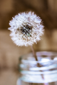A dandelion in seed resting in a mason jar. Neutral tones.