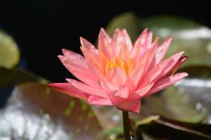 This coral colored waterlily glows in the sun and stands out against the dark lily pad leaves.