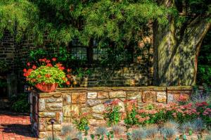 A secret little spot to sit in the shade, read a book, have a drink and enjoy the outdoors with a pot of Geraniums. Photo edited for a little high definition.