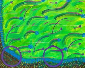 There's another level of creativity involved with how I paint that makes things "interesting". It's called "oops that didn't turn out at all like I wanted, so now what can I turn it into?" A lot of my painting is very impromptu and can sometimes change in an instant if I see something else in the painting. This one has had many lives but in the end what I see is a very windy day and someone lost the wheels to their bicycle! Mixed media art using acrylic paint and gel pens