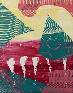 While "retro" could cover a number of time periods, this funky painting/collage makes me think of the 1950's/1960's. When creating this print using a gel plate, I used a handheld jar opener from the '50s to make some of the markings!