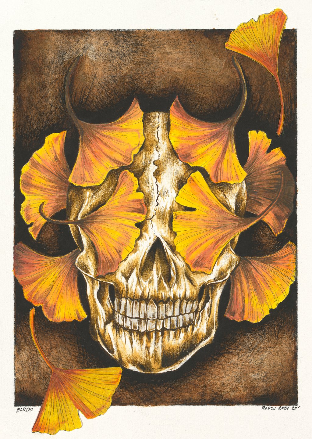 Bardo is the space between dying and the next world. The gingko leaves cover the skull to reflect looking inward and being away from existence in the living world. The leaves that seem to fly away are leading to the next journey. The following artwork is a mixed media piece involving etching and painting.