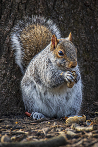 A fantastic photo of a cute little chubby gray squirrel, enjoying a delightful peanut.