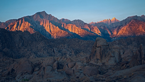 The morning sunrise paints the Eastern Sierras in an alpine glow.