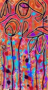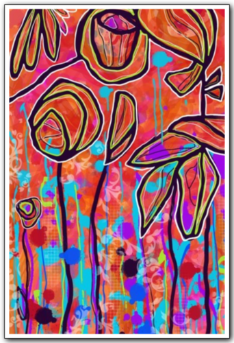 This is a digital design which I created on my iPad. I create each piece by painting digitally and then moving them to my computer to prepare for printing. As in many of my digital creations, you will see bold lines and vibrant colors. Floral pieces are fun to do and this was an experiment that turned into a keeper. Bold it is!