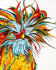 Beautiful, brightly colored Polish chicken by Colorado artist Robin Arthur, aka RobiniArt. Learn more about Robin at www.RobiniArt.com. #polishchicken #chickenart #roosterart #polishrooster