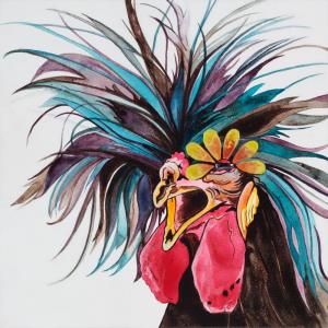 Brightly colored portrait of a Polish Rooster or Polish Chicken by Colorado artist Robin Arthur, aka RobiniArt #chickens #rooster #roosters #chicken #polishhen #polishrooster #polishchicken