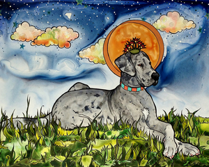 Spotted Great Dane by Colorado artist Robin Arthur aka RobiniArt. Pretty, gray, great dane posing in the grass with puffy clouds and a starry sky.