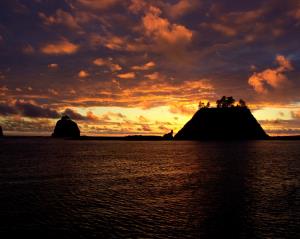 Off the Washington Coast at La Push. A bruised sunset guilds the sky and clouds with gold.