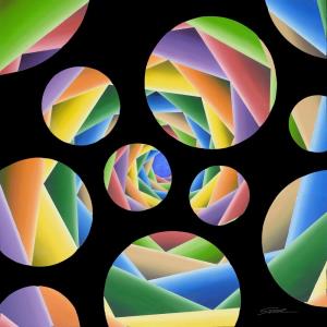 Hybrid copy of the original artwork Circles, I would ask is it just colored circles that draw your attention if so take a minute and look through the black facade and see the picture in its entirety residing behind mask. Perhaps that which is partially hidden is a metaphor for complete, honesty and truth. I guess one question we might ask ourselves is, how much do others see of what we are trying to hide?