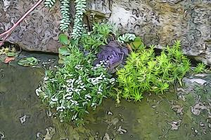 This photo captures varied succulents nestled in an aged wall in the historic San Antonio Botanical Gardens using an in-camera digital art conversion softened watercolor process.