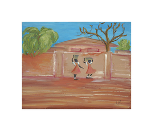 The red clay dust dominates this painting. On my visit to Accra, Ghana, I observed 2 school girls. I saw the pride of being educated in their walk. Let’s educate the world is the theme of this painting titled “Ghana School Girls’.