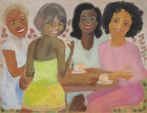 Displaying women having "Coffee In the Garden," this painting captures a happy moment painted to lift the spirit of women of color who were contracting HIV at the highest rate in the late 1990s.