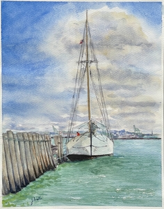 2021- Battery park NY pier, watercolor 11x14 140lbs paper. Boat tied to dock like we are tied to things we must cut loose and go for it.
